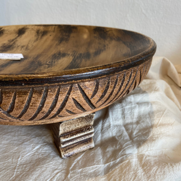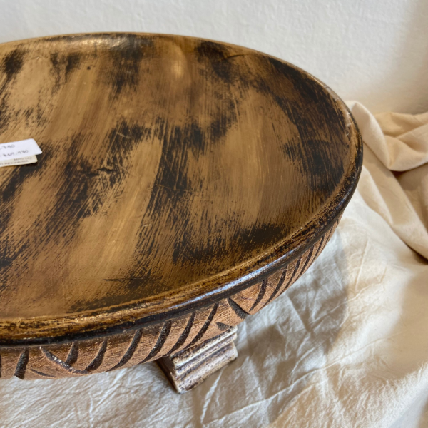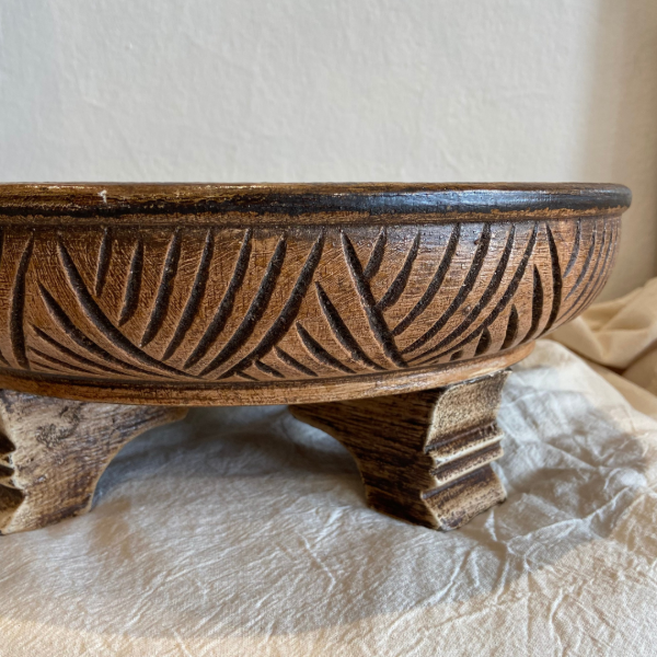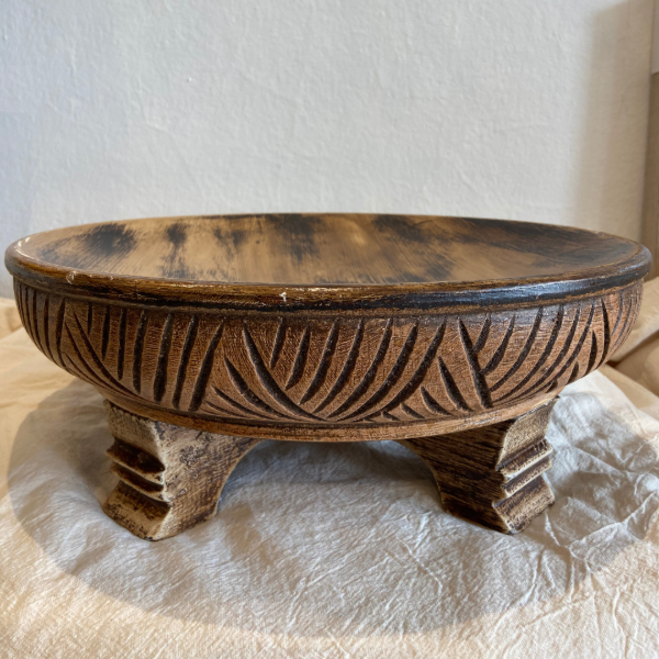 Bandeja madera tallada con patas, color marrón con detalles en tonos negros.