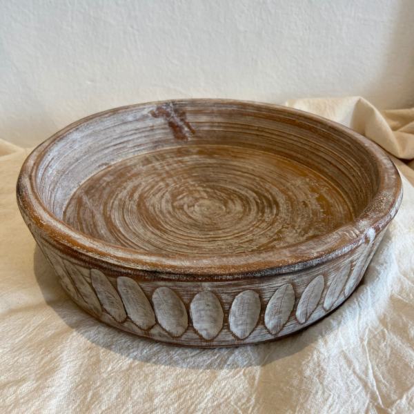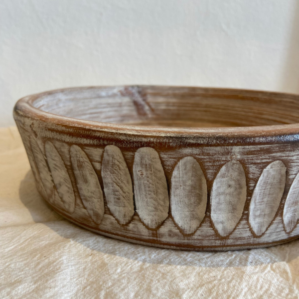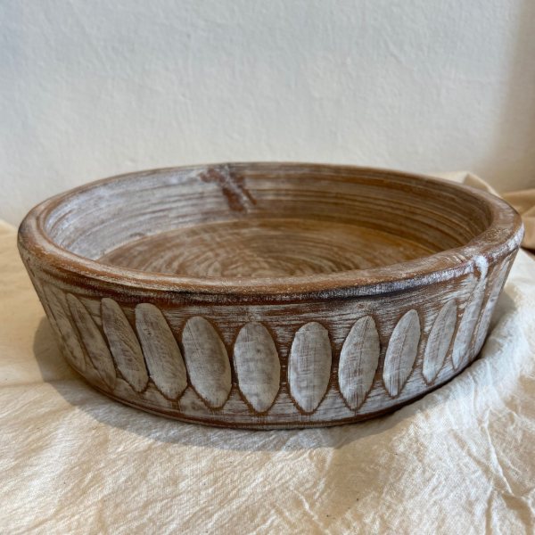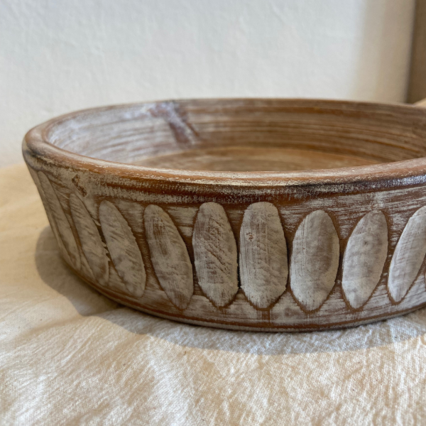Bandeja de madera tallada, con detalles en blanco lavado.